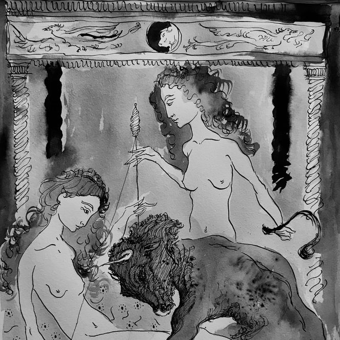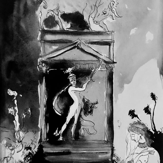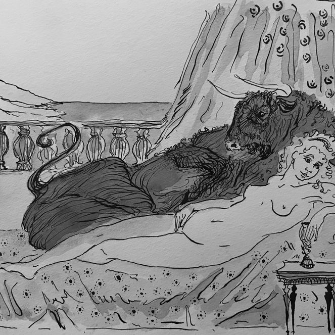 Inspiré par la théorie du désir mimétique de René Girard et par les planches réalisées par Picasso pour la réédition des Métamorphoses d’Ovide en 1931, Gabriel Morantin créé une série de dix dessins originaux retraçant, pour la première fois, la genèse mythologique de la Tauromachie.